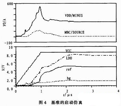 MBC控制作用的简述:在1μs时流过100μA的启动电流,当LDO、ref、bg建立最低工作电压后,启动电路开始关断过程,电流急剧减小,并最终在2μs时接近0A。整个电路正常运行时消耗的电流是266μA。