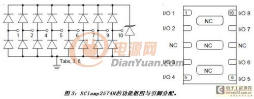 升特公司的最新以太网?;し桨窻Clamp2574N可满足并超过所有上述要求。建议将其放置于变压器的PHY端,尽可能靠近磁体。RClamp2574N可配置为保护一个千兆以太网的全部四对差分线对。如图3所示,八个I/O引脚中的每一个都有一个低电容的控向二极管对,该器件用来将有害的浪涌电流引入内部的低压TVS二极管??叵蚨艿墓ぷ鞯缪菇鲇?.5V,采用升特公司专利的EPD工艺技术制造。低压导通是一个很重要的保护参数,因为很多PHY芯片都集成了ESD?;そ峁?。这些结构并非针对承受很大的电能而设计。如果它们在外部保护实