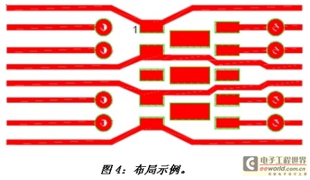 图4显示了RClamp2574N的流通型PCB走线。信号线连接到第1、2、4、5、6、7、9和10脚。第3脚与8脚连接到三个中心接地。在一个典型以太网应用中,这些引脚以及接地都应悬空(即不接地)。在本例中,走线宽度为0.005英寸。过孔用于第6、7、9和10脚的换层连接,这样所有八根信号线都可采用易于实现的流通型(flow though)布局。