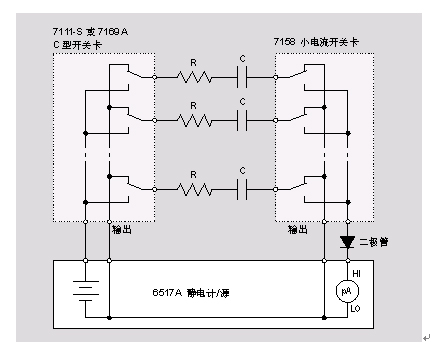 一个“同轴三柱-BNC”转换器(7078-TRX-BNC型)被用于将6517A连接到7158型开关卡。电容器通过低噪声同轴电缆连接到7158型开关卡。可使用绝缘线将7111-S开关卡连接到电容器。7169A型是通过接线头连接器进行连接。