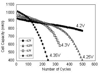 图 4:LiCoO2 阴极锂离子电池的充电电压和使用寿命之间的关系