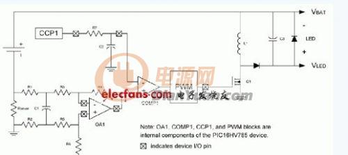 然后,应用程序代码可以测量供电电压(利用片上集成的10位A/D转换器)和供电电流,从而保证驱动LED工作在恒定功率模式。随着电池输入电压的变化,D/A电路(采用CCP外设实现)将产生新的参考电压值进行补偿。