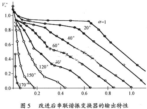 图4中最大的功率曲线(α=1)即对应于变换器开环工作,图4中停留在底部的曲线是对应于轻载的情况。工作在归一化的输出电流I*o=0.15%且ψ=1时,结果产生大约30%的过压。改进变换器的输出特性为双斜率输出特性,使电路提高了电压、电流限制的固有能力,改善了高压电源的空、满载的适应性,同时有利于高压电源宽范围的输出调节。