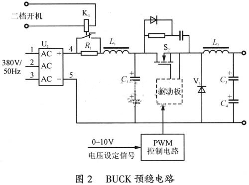 三相交流配电经整流滤波电路之后,形成500V左右的直流电压加在。BUCK预稳电路的输入端。其中K1为抑制合闸浪涌电压而设置的,其二档吸合信号由电源控显电路给出。S2为BUCK功率开关管,其工作脉冲由PWM控制电路给出,为了保证电源具有足够的动态特性,该功率开关管工作频率为100kHz左右。PWM控制器输出脉冲宽度,由电压设定信号给出。当电压设定信号由0~10V变换时,PWM控制器输出的脉冲占空比在0~0.85的范围内变化。L2为储能电感,由于BUCK电路的占空比在0~0.85大范围变化,为了保证电路起到预稳作用,需要避免输出电流断续,同时不至于设计余量过大,采用了额定负载条件下的计算值,实际工作情况良好。