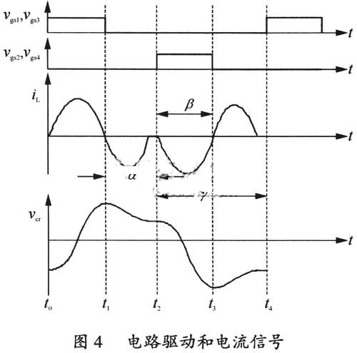 电路的谐振槽路的电流波形和驱动信号波形如图4所示,通过调节α角控制变换器的输出功率。