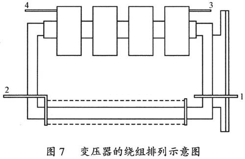 为了减少高压绕组和低压绕组之间的分布电容,确保高压绕组和低压绕组之间的绝缘,需要将原边绕组绕制在矩形铁心的一边,副边绕组绕制在矩形铁心的另一边,并留足原、副边间的距离,最后用环氧树脂灌注作为主绝缘。
