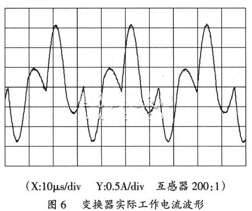 整个变换器电路依然采用PFM的工作模式,当前级预稳电源输出0~500V直流电压时,变换器以固定的脉冲宽度驱动桥臂的功率开关管。为了保证电源在电子枪束流产生时能稳定工作,设计了取样闭环控制功能,当输出偏离电压设定值时,变换器通过脉冲频率调节得到稳定的输出,电子枪高压电源实际工作频率为3~25kHz。改进后的串联谐振变换器如图5所示,变换器的实际工作电流波形如图6所示。