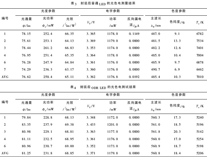 对封装后的样品选取普通LED 和ODR LED 各7个,两类LED中不同样品各自编号,先进行LED的快速光色电测试,测试仪器为杭州远方HAAS- 2000 LED 快速光色电综合测试量系统,测试温度为25℃,测试电流为350 mA,两组LED 的测试结果如下,表3 中去除5 号、表4 中去除5 号和7 号等性能不佳的样品,两组样品测量反向漏电流时的反向电压均为- 5. 008 V.