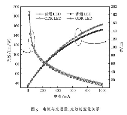 对两种LED 的光通量和光效随电流变化进行测量,测量条件与I-V 特性测试相同. 结果如图6 所示,从图中明显看出,两种LED 的光通量随着电流升高而逐渐升高,光效均随着电流的升高而逐渐降低; 而ODR LED 的光通量和光效要始终高于普通LED,这从光通量和光效随电流变化的角度来证实了ODR LED 的优势.