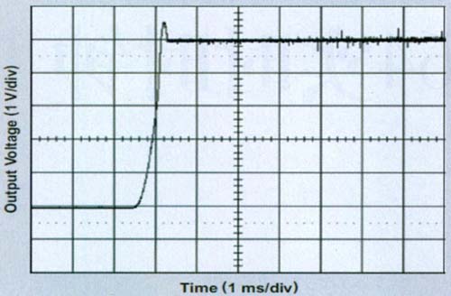 在一些典型的启动应用中,TPS64203限流值慢慢上升,以提供限流的受控软启动。在这种应用中,限流电路和软启动均无效;因此,启动浪涌电流会很大,而输出电压会稍稍过冲,如图 4 所示。