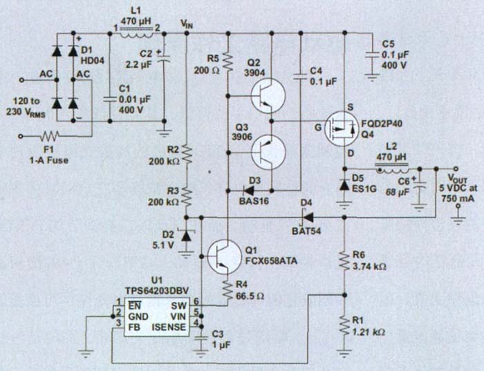 图 1 显示了完整的转换器。整流器电路使用一个标准、快速开关整流器二极管桥接 (D1) 和一个LC滤波器(L1和C2),我们将对其余组件进行更加详细的介绍。