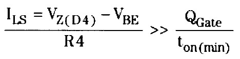 电容C4和二极管D3对驱动电路的功能至关重要。通过选择电阻R5来将12V栅极驱动电平设置在整流器输出电压以下。二极管D3将电容C4限定在这一电平。特别是,当U1的开关引脚输出一个低信号来开启功率FET时,信号被电平位移到Q3的基极。晶体管Q3开启,并快速地将Q4的栅—源电容CGS充电至 12V。如果没有C4和D3的话,关闭Q4会让Q3成为一种漏极接地的昂贵的高压双极型晶体管。当U1的开关引脚输出一个高信号来关闭功率FET时,该信号被电平位移至Q2的基极。Q2开启,有效地将Q4的栅极与输入电压连接。在没有起到本地电源作用的电容C4的情况下,晶体管Q2和Q3无法提供快速(且因此而高效地)上拉或下拉Q4栅极电容所必需的快速电流峰值,注意到这一点很重要。另外,由R4设定的电平位移器电流ILS必须足够高,以在ton(min) 期间移动Q4的栅极电荷QGate。也就是说: