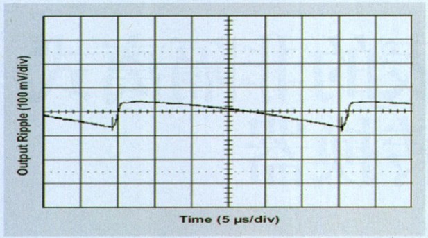 相对较高的K值最小化了电感值,并且经证明是可以接受的,因为这种特殊应用的稳态输出纹波要求小于0.02 × VOUT,即高负载时的100mVPP。磁滞后,TPS6420x控制器一般在输出电压有一些纹波时工作效果最佳,建议使用至少 50mΩ ESR的输出电容可产生ΔVPP(ESR) = ΔIL × RESR的纹波电压,其一般远超出电压纹波的电容分量。图2显示了该应用测得纹波。