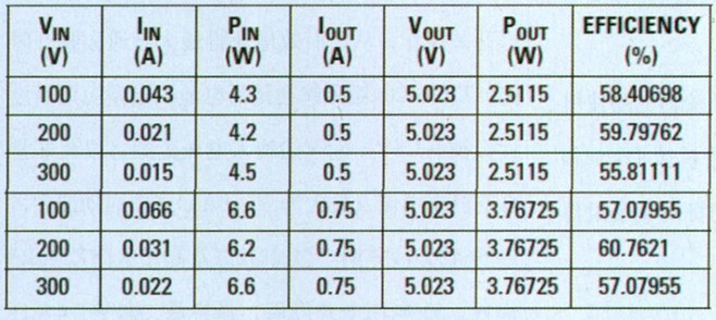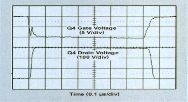 电容C4值设定大于Q4的栅极电容,但其必须足够小,以便在更短控制器最小导通与断开时间期间能够得到再充电。图3显示了300V和500mA负载输入电压下,一个开关周期的栅极和漏极导通/断开时间。表1显示了测得的转换效率。