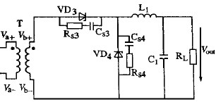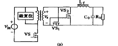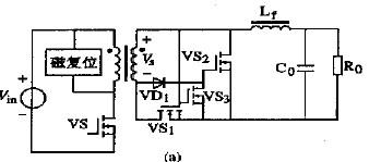 当主开关管VS 关断时,励磁电流流经磁复位电路。变压器次级电压反向,VS1 和VS3 关断。VS2 的栅2源极寄生电容由流经VD 的电流充电。输出电流由VS2 续流。在t2 时刻,磁复位结束,变压器次级电压为零。因为VD1 承受反压截止,VS3 关断,VS2 的栅极驱动电压不变,因此即使变压器次级电压为零,VS2 保持导通续流。VS2 栅极驱动电压一直保持到下一个开关周期开始,且VS3 导通之时。这就解决了死区时间内体二极管导通的问题。