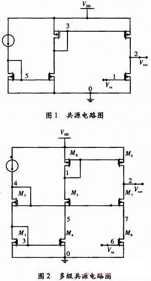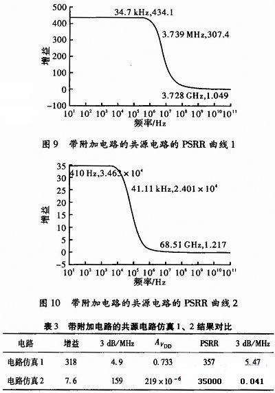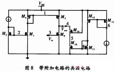 带附加电路的共源电路如图7和图8所示,消除了使用工作以线性范围内的共源放大器,从VDD到输出节点电源波动的影响。