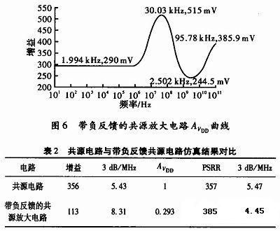 通过从VDD到输出端能够反方向影响电源波动的负增益改善PSRR,从而反映到放大电路的输出端。共源放大器为应用这一技术提供了支撑,结果已被证实。