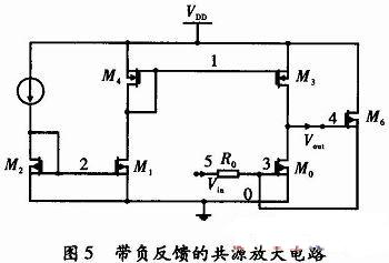 为构建负反馈方法改善PSRR,对一种带有负反馈的共源放大电路进行了仿真,并与图1中仿真的不带负反馈的共源放大器进行了比较。负反馈的电路如图5所示,输出电压被采样并控制M6,由M6的电流通过R0转换为电压,输出电流及M0的输入电流混合构成。负载器件是PMOS管,其偏置电压由一镜像电路产生。在设计过程中,其电阻值是关键,因为它决定着增益和PSRR值之间的平衡。电阻值过大会损失增益。