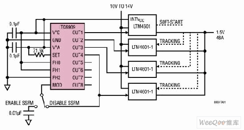 图1:采用扩频调制,可提供1至8个输出的多相硅振荡器LTC6909。