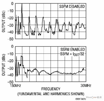 当SSFM频率的范围增加时,带内时间的百分比减少。如果发射信号偶尔进入接收器的频段而且停留的时间很短(相对于其响应时间),则可以显著地降低EMI。例如:在降低EMI方面,±10%的频率调制将比±2%的频率调制有效得多。然而,开关稳压器所能容许的频率范围是有限的。一般来说,大多数开关稳压器都能很容易地承受±10%的频率变化。