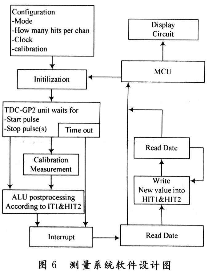 初始化之后,TDC-GP2高速测量单元接收到START脉冲后开始工作,达到设置的采样数或者遇到测量溢出后才停止工作。软件设计的重点在于根据需要设置TDC-GP2的工作模式和读取其内部的测量数据。在测量结尾,ALU开始依照HIT1和HIT2的设置处理数据并把结果送入输出寄存器。如果不进行校准,ALU传输16位原始数据到输出寄存器;如果进行校准,则ALU传输32位的固定浮点数到输出寄存器。然后通过单片机AT89S52处理后,在液晶显示器读取时间间隔数据,其测量流程如图6所示。