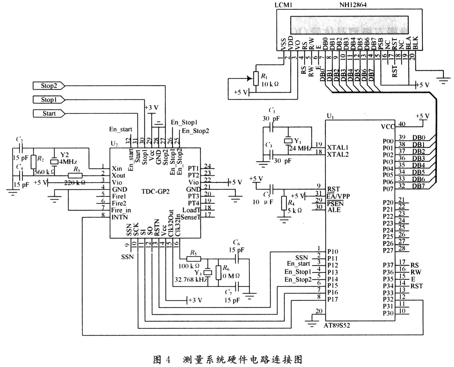 系统主要由脉冲信号取样器、脉冲输入信号整形电路、TDC-GP2测量电路、AT89S52单片机、液晶显示电路、电源电路、时钟电路组成。TDC-GP2的每个测量通道都提供一个使能引脚,可独立地设置这两个引脚进行通道选择。TDC-GP2需要一个2~8 MHz的高速时钟进行校准用。TDC-GP2只是在进行时间测量时才必须用振荡器,且能够自动控制振荡器的开启时间。整个系统的硬件电路连接如图4所示。