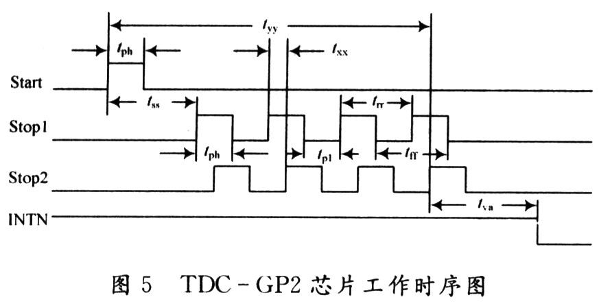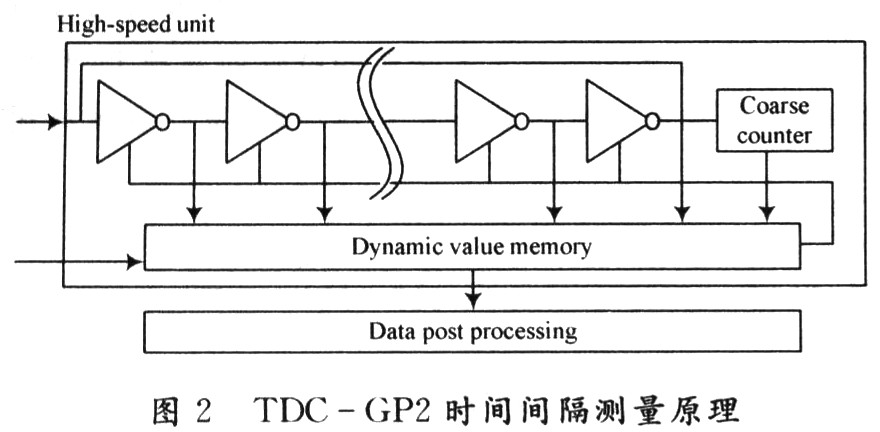 该系统主要由脉冲产生器、数据处理单元、时间数字转换器、温度测量单元、时钟控制单元、配置寄存器以及与单片机相接的SPI接口组成。在实际应用中,由于TDC-GP2的功耗很低,使得TDC-GP2的输入/输出电压(工作电压)为1.8~5.5 V,核心电压为1.8~3.6 V,所以可以采用电池供电,使用方便。同时单片机由4线的SPI接口相连,可以把TDC-GP2作为单片机的一个外围设备来操作。通过内部ALU单元计算出时间间隔,并将结果送入结果寄存器保存起来。通过对TDC-GP2内部寄存器的设置,可以多次采样并将结果保存。TDC-GP2是基于内部的模拟电路测量“传输延时”来进行的,是以信号通过内部门电路的传播延迟来进行高精度时间间隔测量的。TDC-GP2时间间隔测量原理如图2所示。