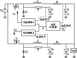式中:Vc1、Vc2分别为C1和C2上电压的平均值;IL1、IL2分别是L-和L2流过电流的平均值,亦即两路输出电流平均值;R1及R2是滤波电感的等效串联电阻,当在工艺上设计并联电源每路输出电感基本上一样时,可以认为R1=R2。因此,要控制两路电流均流,即要求IL1=IL2,于是,只要控制Vc1=Vc2就行了。所以,电容C1及C2上的电压Vc1和Vc2可以代表两路电流IL1及IL2大小,可用来进行均流控制。