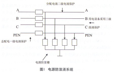 智能仪表控制系统的电源是从配电系统进入计算机主控室。电源系统是从发电厂通过变压器、配电系统最后供仪表系统使用,在雷暴天气中电源输送进由于环韦多途径长,极可能遭受雷击,因此此时的电源并不是380v或220v、50Hz交流电,而是参杂了各种杂波的浪涌电压,如果不设置防浪涌?;は低?,那么使用中的电器设备会因超过耐压极限而发生事故。将总配电进来的A、B、C、D三线四相并接至电源浪涌器所相对的A、B、C、D接线柱上。在雷暴时感应雷浪涌通过电涌?;て鞅;そ氐缌骰闳氪蟮兀涑龅缪骨圃诎踩ぷ髑?,确保电源安全运行。电源防浪涌系统如图1所示。