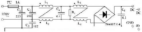 采用无源的EMI滤波器是抑制传导干扰最有效的办法。即在电路中插入一个带通滤波器,让50 Hz交流电畅通,其余频率的信号受阻。但要严格控制滤波器LC元件的寄生参数,它们的制作工艺、安装位置、走线方式,都会影响EMI滤波效果。加接图1所示的滤波电路,可以控制通过传导耦合进入电网的噪声电平。