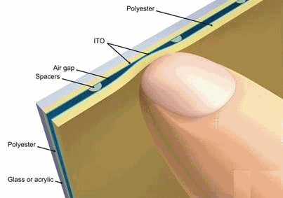 相反地,这种技术的主要缺点源于触控屏幕的多层结构。其基层一般是玻璃,表面涂有一层均匀的ITO,顶层通常由聚乙烯对苯二甲酸酯(PET)制造,内表面(Inner Surface)也涂有一层均匀的ITO,而外表面(Outer Surface)则有硬涂层,以为保护作用,而形成空气隙以把这些导电层隔离开的细小透明间隔点常在打印制程中产生。这种多层材料堆栈的多层结构对透光性有所影响,一般将降至约透明玻璃透光率的75%,同时,空气间隙可能产生薄雾效应,进一步降低清晰度。此外,这种结构很容易刮伤损坏,而且因为机械轴性不重合,还须仔细校准以确定X、Y坐标范围,其它弱点还包括可能吸收电气噪声,尤其是来自液晶显示器(LCD),这时一般须进行滤波,将导致反应时间的延长,当然,控制器一次只能处理一个触摸位置,也是一大局限。