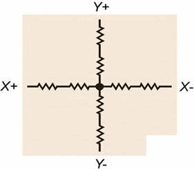 在最简单的四线(Four-wire)电阻式连接中,顶层两端和低层两端分别各连接两个电极,两层的电极互相呈九十度交叉,形成四线星状连接结构,这实际上就是一对彼此正交的电位计(图2),相当于机械操纵杆的平面屏幕模拟。为了在X轴方向测量触摸位置,触控板的控制器将X-设为接地,而X+偏置为参考电压,然后从Y层的两端读取电压,以找出X轴上两层的接触点。同样地,控制器透过在Y层的电极上加载驱动电压,并从X层读取触摸点电压,可以确定Y轴上的触摸位置。