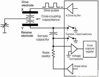 和RC及AC技术相同,单端电荷转移电容传感器也是在每个感测通道采用一个电极板,但不依赖于时序测量或放大器,而是采用互补式金属氧化物半导体(CMOS)开关把电荷泵入Cx,并把电荷转移到一个参考采样电容(Cs)中。透过计算Cs达到预先设定的电压值所需的周期数,就可很容易求得电荷电平,且这个周期数与Cx成反比。众所周知,电荷转移方法有助于抑制泄漏电流的影响,而且由于其采用一个很大的Cs作为检测器,这个检测器相当于对外界的一个低阻抗,故其抗外部电气噪声的能力非常强。