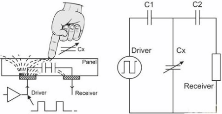 与之相反,横向模式电荷转移感测是每个感测元素都采用两个电极。基本上,其电气行为与单端电荷转移感测相同,但这些电路在发送/接收矩阵中采用电极数组创造触控屏幕功能。该方案的优点是其需要的布线较少,更甚之能同时识别和区分多个触点之间的差异,单端电路也可感测多个触点,不过由于讯号本身模糊,故不能区分。此外,横向模式方案还有速度快和功耗低的优势,因为其能同时测量一条驱动线路上的所有节点,所以可减少50%的采集周期数。这种双电极式结构具有自我屏蔽外部噪声的功能,在定功率级上可提高讯号稳定性,因此,量研科技(Quantum Research)一直将横向模式感测技术作为驱动触控屏幕的主要方案,利用高载模式采样、扩频调制及数字讯号处理等各种增强型技术的结合,促成抗噪声源干扰能力强,即使在恶劣环境下也较稳健的解决方案。