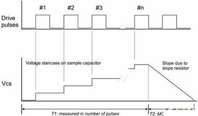 脉冲串产生的第一个斜坡是加到采样电容上的梯级波形讯号,脉冲串过后,驱动器把斜率电阻的参考端切换为高电平,对采样电容进行放电,直到将电荷用完,电压比较器检测出零交叉点为止,获得零交叉点所需的斜坡时间与X、Y电荷耦合成比例,并随用户手指触摸面板表面而减小(图5)。