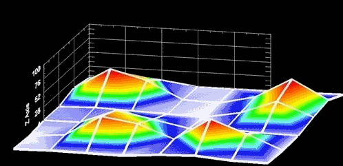 利用单层膜同步执行双触点检测也是可行的,但若采用能够同时解决多触点事件的双层技术,性能便会好得多。如图7显示在一个实验室测试模型中使用者用三根指头和大拇指时,电场的三维测量结果。