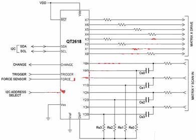 透过连接一个放在六电极Y层上的八电极X层,控制器可支持大至8寸的双触控屏幕,而且这种多功能控制器能感测多达六个滑块或四十八个离散式按键,或按键、滑块与触摸区域的组合,该控制器为接脚数精简的版本,利用类似的简单布线图(图8),能够驱动八条X轴和接收四条Y轴,或区分多达三十二个离散式按键。