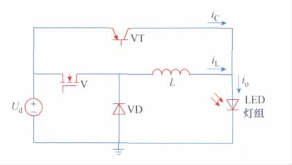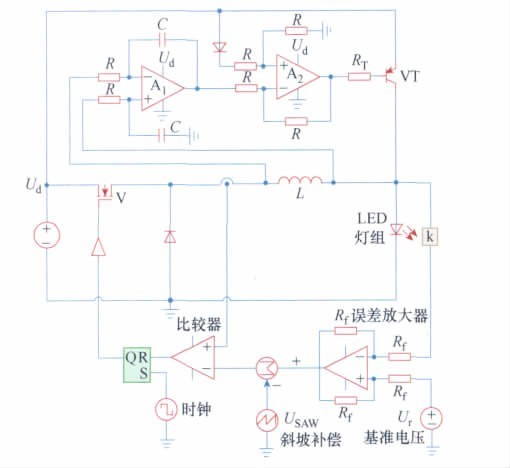 电路如图1 所示。电路结构以BUCK电路为主,取消电解电容滤波,用辅助线性电路对电感纹波电流进行补偿。图中由开关管V、电感L、LED 灯组、续流二极管VD 组成主电路; 晶体管VT 为辅助补偿电路。