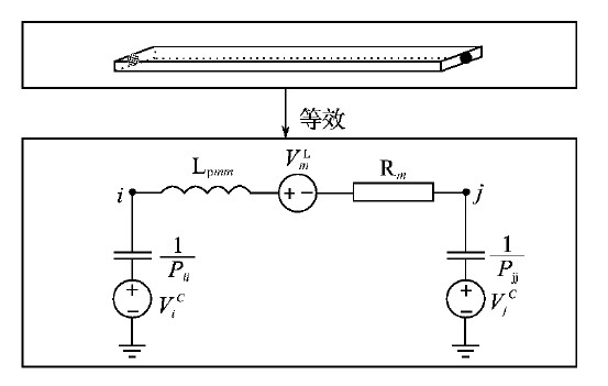 J.Ekman提出了基于寄生参数矩阵的等效电路的建立方法,即把所有互感、互容等效成受控的电压源,与自感、自容连接(相当于把所有互感、互容对电路的影响等效到受控电压源上),从而建立等效电路模型。图4所示为任意两个节点间的等效电路模型。