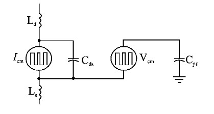 由于需要分别对DM 噪声和CM 噪声进行分析,所以对DM 噪声源和CM 噪声源也需要分别建模。M.Nave提出使用电流源作为DM 噪声源,使用电压源作为CM 噪声源的方法,就是因为DM 噪声主要由di/dt引起,而CM 噪声则主要由dv/dt引起。在此基础上对CM 噪声源进行改进,考虑了电压过冲和下冲,并且在线路阻抗近似平衡的情况下,利用DM 电流源和一个电压源来表示CM 噪声源(如图2所示)。