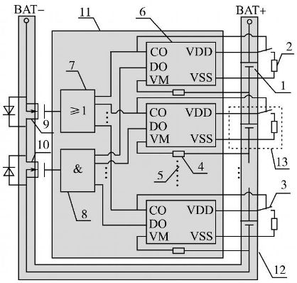 采用单节锂电池?;ば酒杓频木弑妇獬涞缒芰Φ娘绯刈楸;ぐ迨疽馔既缤?所示。其中:1为单节锂离子电池;2为充电过电压分流放电支路电阻;3为分流放电支路控制用开关器件;4为过流检测?;さ缱瑁?为省略的锂电池?;ば酒暗缏妨硬糠?;6为单节锂电池?;ば酒ㄒ话惆ǔ涞缈刂埔臗O,放电控制引脚DO,放电过电流及短路检测引脚VM,电池正端VDD,电池负端VSS等);7为充电过电压?;ば藕啪怦罡衾牒笮纬刹⒘叵登鞯缏分谐涞缈刂朴肕OS管栅极;8为放电欠电压、过流、短路?;ば藕啪怦罡衾牒笮纬纱叵登鞯缏分蟹诺缈刂朴肕OS管栅极;9为充电控制开关器件;10为放电控制开关器件;11为控制电路;12为主电路;13为分流放电支路。单节锂电池?;ば酒恳谰蒿绯刈榈绯厥咳范?,串联使用,分别对所对应单节锂电池的充放电、过流、短路状态进行?;ぁ8孟低吃诔涞绫;さ耐保ü;ば酒刂品至鞣诺缰房仄骷耐ǘ鲜迪志獬涞纾梅桨赣斜鹩诖车脑诔涞缙鞫耸迪志獬涞绲淖龇?,降低了锂电池组充电器设计应用的成本。