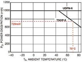 另一种评估封装热特性对应用性能影响的方法是检查功率下降曲线。图2显示了NCP1529的曲线,详述了µDFN-6和TSOP-5封装最大环境温度阈值与功率耗散之间的关系。