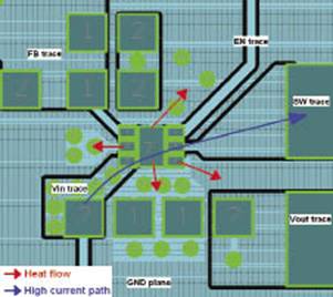 图3显示了使用µDFN-6封装的NCP1529时推荐的焊盘布线,顾及到了电气和热设计注意事项。红色箭头表示热能由封装流向周围环境。