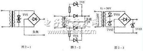 图2-3所示电路中,单向TVS1和TVS2反接并联于电源变压器输出端或选用一个双向TVS,用以?;ふ鞯缏芳案涸刂械脑骷?。