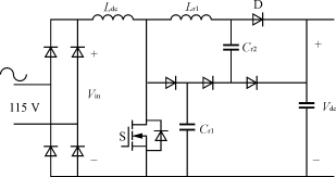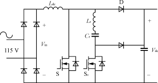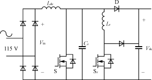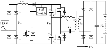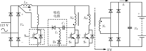另一个降低器件电压定额的方案是采用两级变换结构。前级PFC校正环节可以采用带有软开关功能的Boost变换器,允许高频工作。后级DC/DC功率变换级,可以采用半桥串联谐振变换器,提供高频电流链。图7给出了适用于充电模式1的两级功率变换电路结构图。