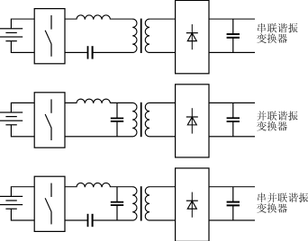 图12给出这些基本的谐振变换器拓扑示意图。在串联谐振变换器中,谐振电感与变压器原边串联,而其他类型变换器中,电容与变压器串联。只有串联谐振变换器是硬电流源特性,而其他类型变换器是硬电压源型。