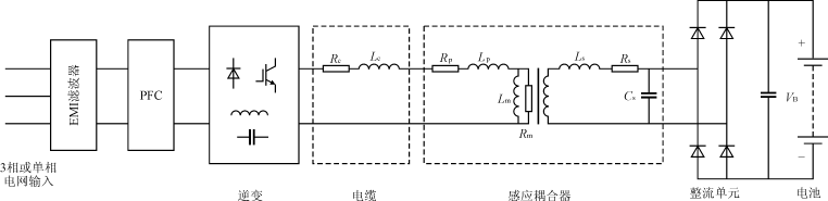图2给出电动汽车感应耦合充电系统的简化功率流图。图中,输入电网交流电经过整流后,通过高频逆变环节,经电缆传输通过感应耦合器后,传送到电动汽车输入端,再经过整流滤波环节,给电动汽车车载蓄电池充电。