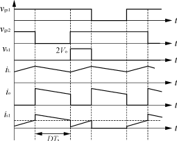 当原边开关管S1及S2均开通时,能量储存在输入滤波电感中,同时输出整流管处于关断态。当开关管S1及S2中任一个开关管关断时,储存能量通过原边绕组传输到副边。由于变换器的对称工作,变压器磁通得以复位平衡。