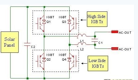 本文分析了太阳能逆变器应用的全桥拓扑。这种拓扑利用正弦脉宽调制技术,在高于20kHz情况下,为高压侧IGBT 进行转换。支线的低压侧IGBT决于输出频率要求,在50Hz或60Hz进行转换。若挑选最新的600V槽栅IGBT,其总功耗将会在20kHz下达到最低。在低压侧IGBT方面,标准速度平面式IGBT是最佳选择。标准速度IGBT在50Hz或60Hz下拥有最低的导通损耗,其开关损耗对整体功耗来说微不足道。因此,工程师只要正确选择IGBT组合, 就能将太阳能逆变器应用的功耗降至最低。