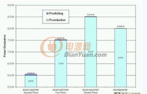 低压侧IGBT同样有同一问题。究竟哪一种IGBT才能提供最低的功耗?由于这些IGBT只会进行 50Hz或60Hz切换,如图5所示,标准速度IGBT可提供最低的功耗。虽然标准IGBT会带来一些开关损耗,但数值并不足以影响IGBT的总功耗。事实上,最新的槽栅IGBT仍然拥有较高的功耗,因为这一代的槽栅IGBT专门针对高频率应用而设计,以平衡开关和导通损耗为目标。因此,对低压侧IGBT 来说,标准速度平面式IGBT仍然是必然选择。